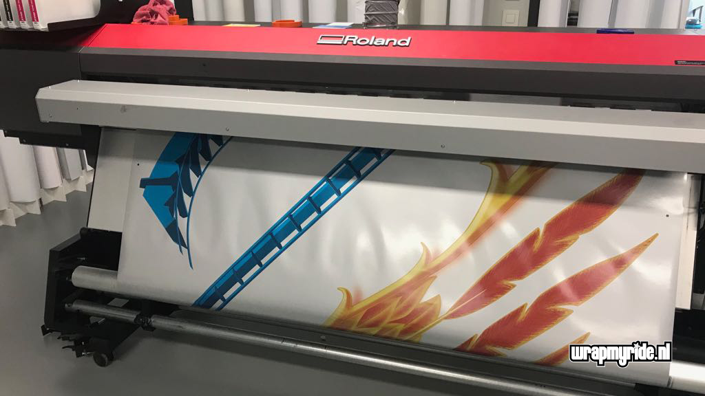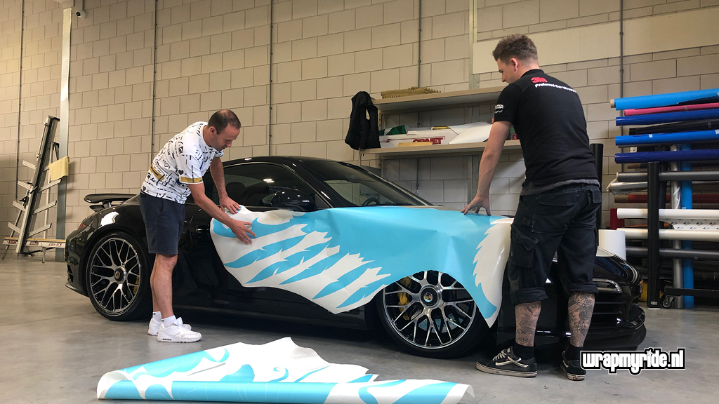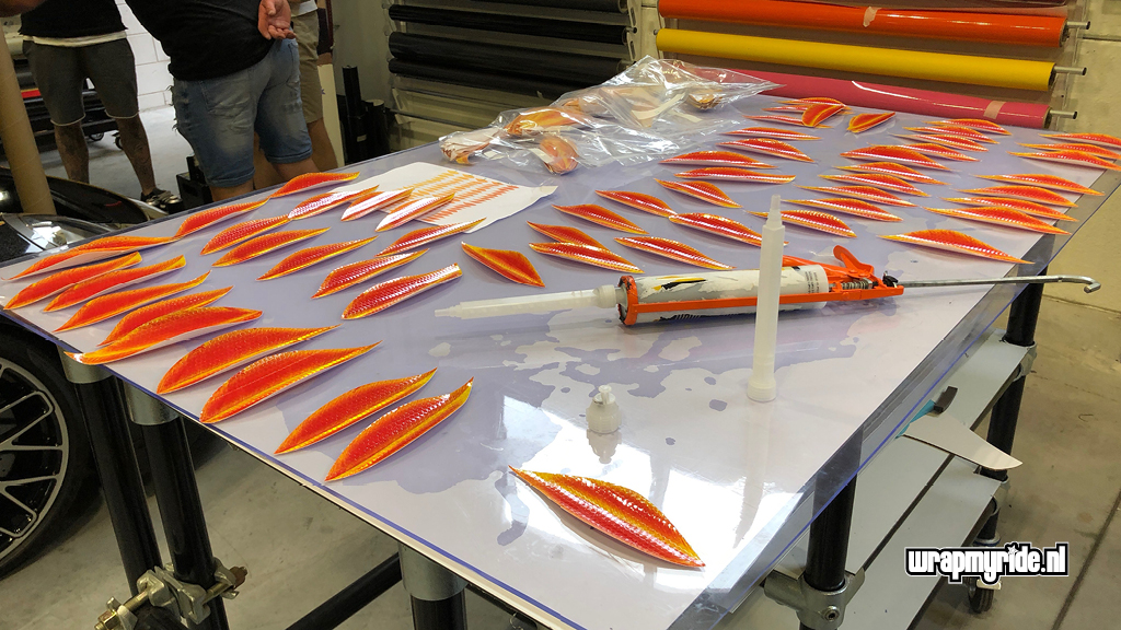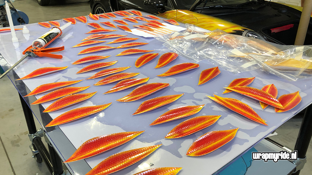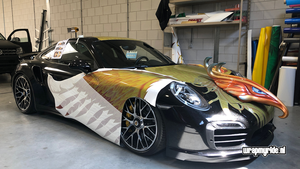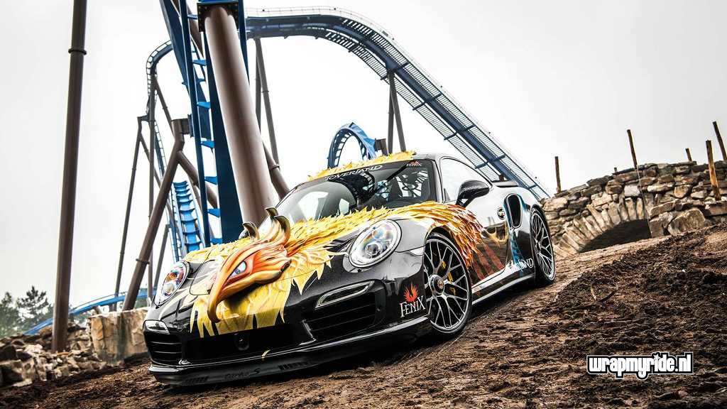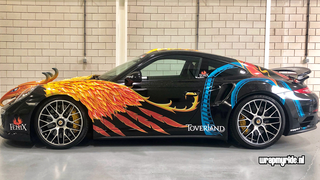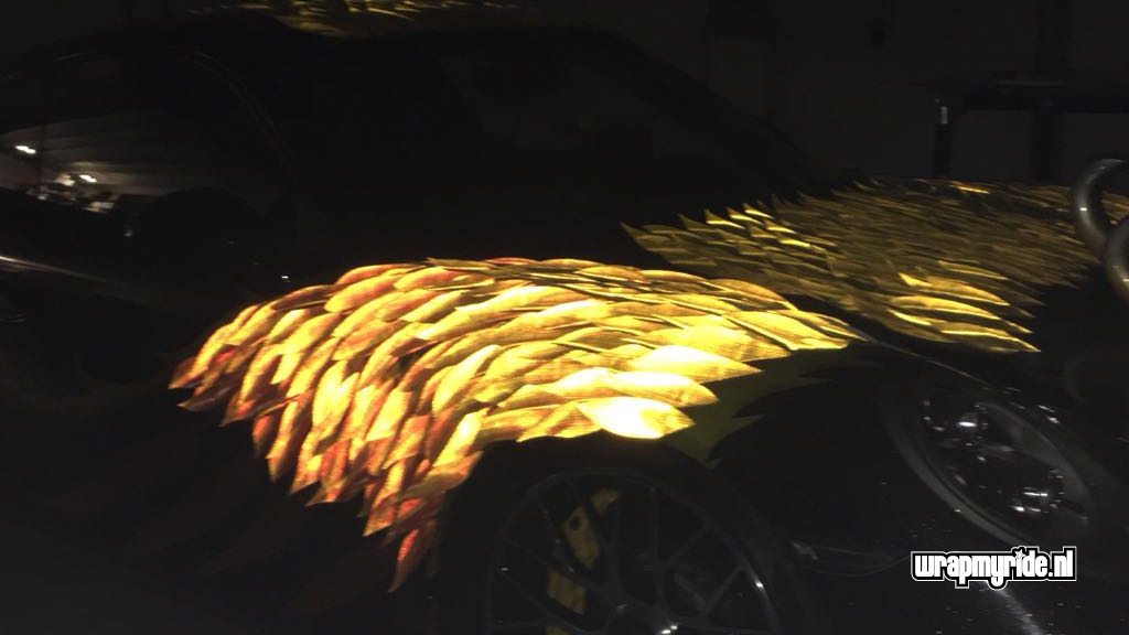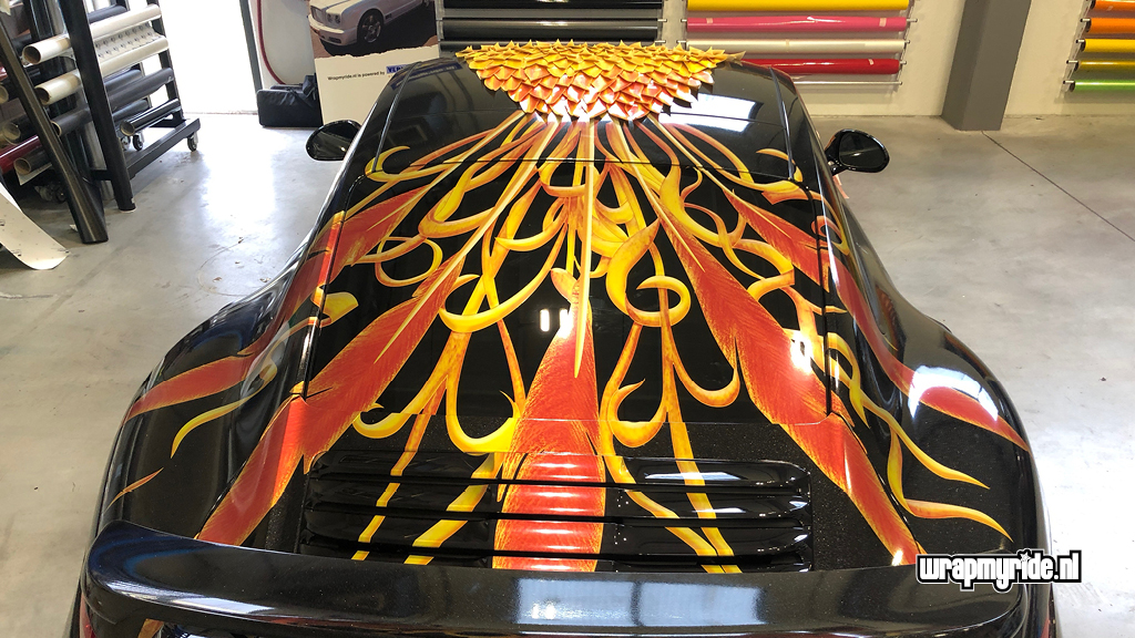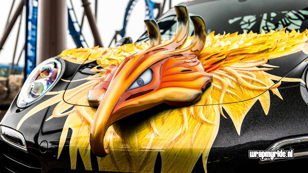 “Op deze Porsche hebben we diverse foliesoorten, snijtechnieken en prints toegepast. De veren op de voorspatborden zijn gesneden uit retro-reflecterend zeildoek dat we in vurige kleuren hebben geprint. De voorzijde wordt gesierd door een 3D fenikskop. Tijdens het ontwerpen bedachten we dat het wel mooi zou zijn als deze showcar vuur zou spuwen. Wat eigenlijk begon met een geintje, kon al snel op enthousiasme rekenen van onze klant. We hebben daarom een pyrotechnicus in de arm genomen en hebben twee vuurwerkkanonnen gemonteerd.”