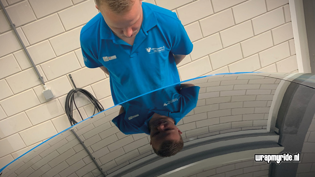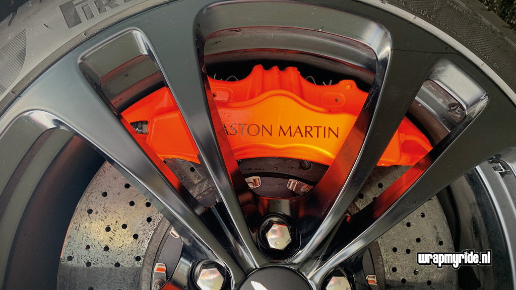 Remklauwen: Fluor oranje gespoten met Austin Martin logo's in Avery 900 SuperCast Gloss Black